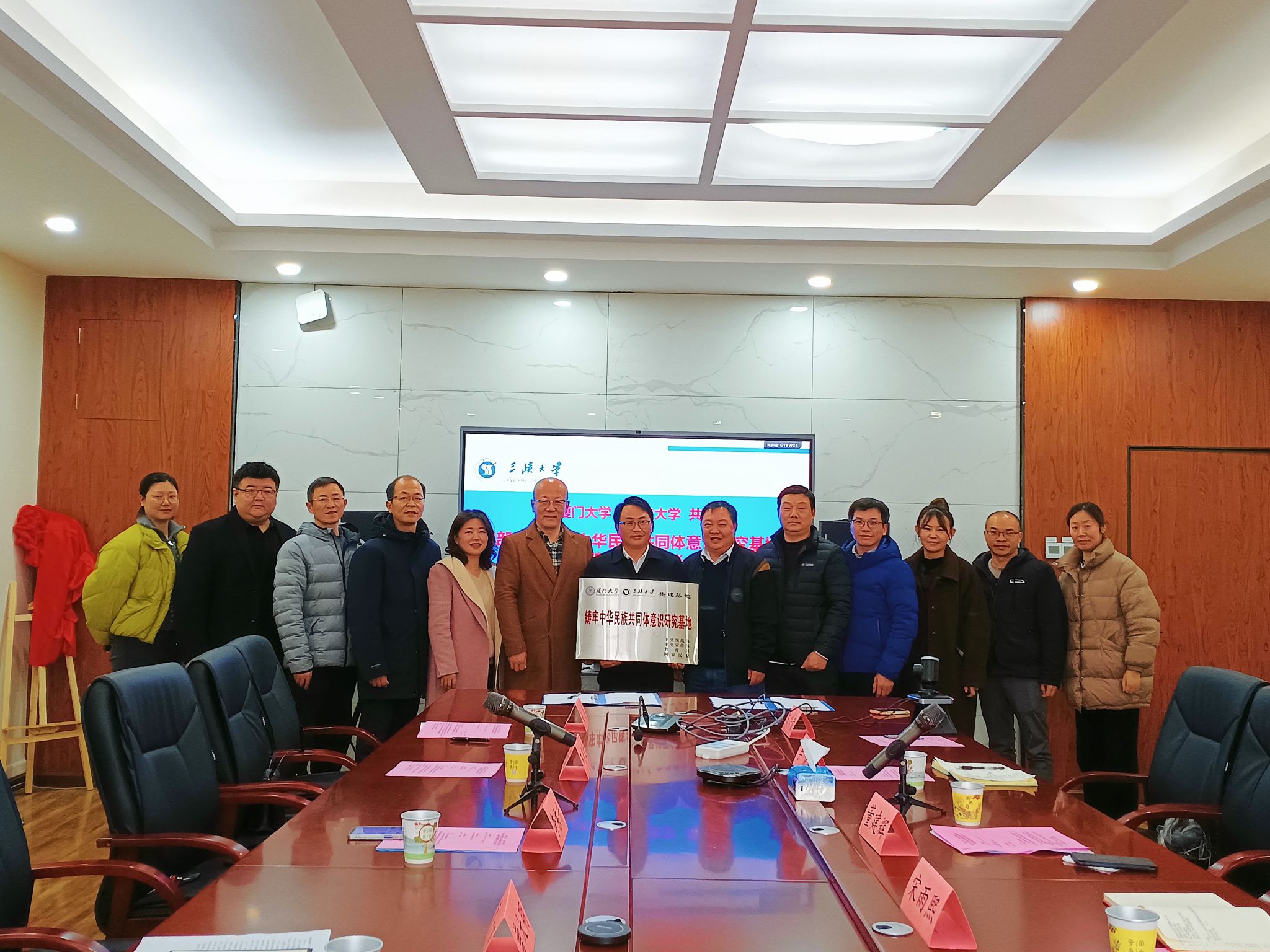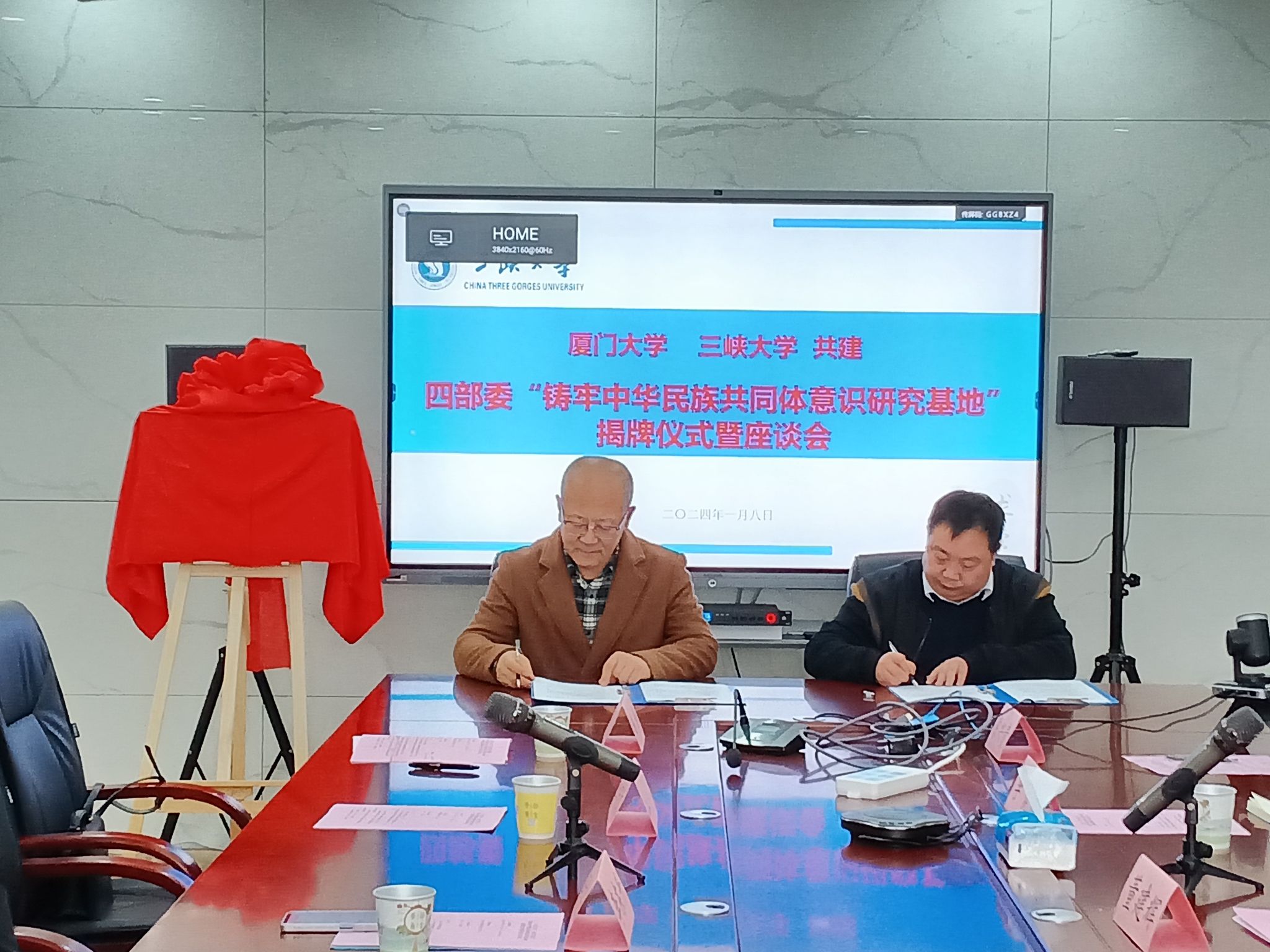 本网讯(通讯员 彭娟/文/图) 1月8日下午,我校与厦门大学共建四部委“铸牢中华民族共同体意识研究基地”揭牌仪式在三峡智库会议室隆重举行。厦门大学中华民族研究中心执行主任董建辉教授,我校党委常委、副校长李东升教授出席会议。会议由学校党委统战部常务副部长赵静主持。