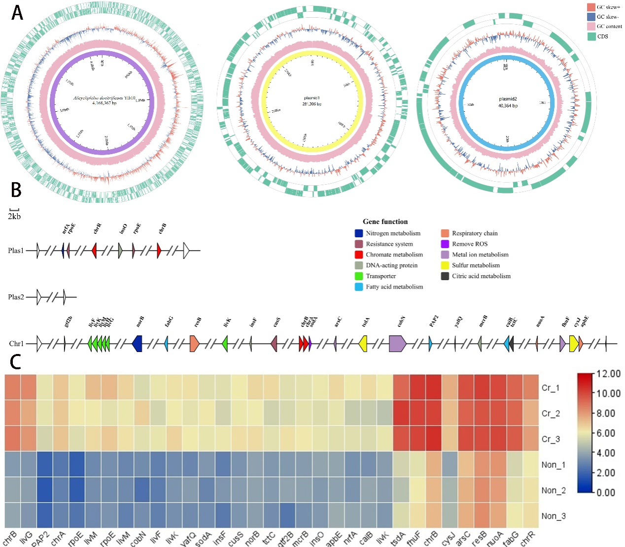 图2 脱氮嗜脂环物菌Ylb10的基因组结构和铬代谢相关基因