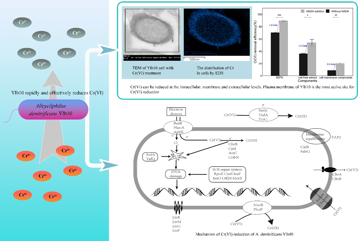 我校龚大春教授团队的吕育财老师研究组从环境中分离得到的 Ylb10,能够以小分子有机酸和氨基酸作为氮源,修复Cr(VI)污染污水。研究组还深入探索Ylb10菌株还原Cr(VI)的特征,包括Cr在菌体细胞内分布、菌体成分还原Cr(VI)效率、菌体细胞透过Cr的效率、菌体表面结构等特征,并与基因组、转录组参数相关联,揭示了脱氮嗜脂环物菌Ylb10菌株还原Cr(VI)的可能途径,拓展了对Cr(VI)污染修复微生物类群的代谢机理的认识。