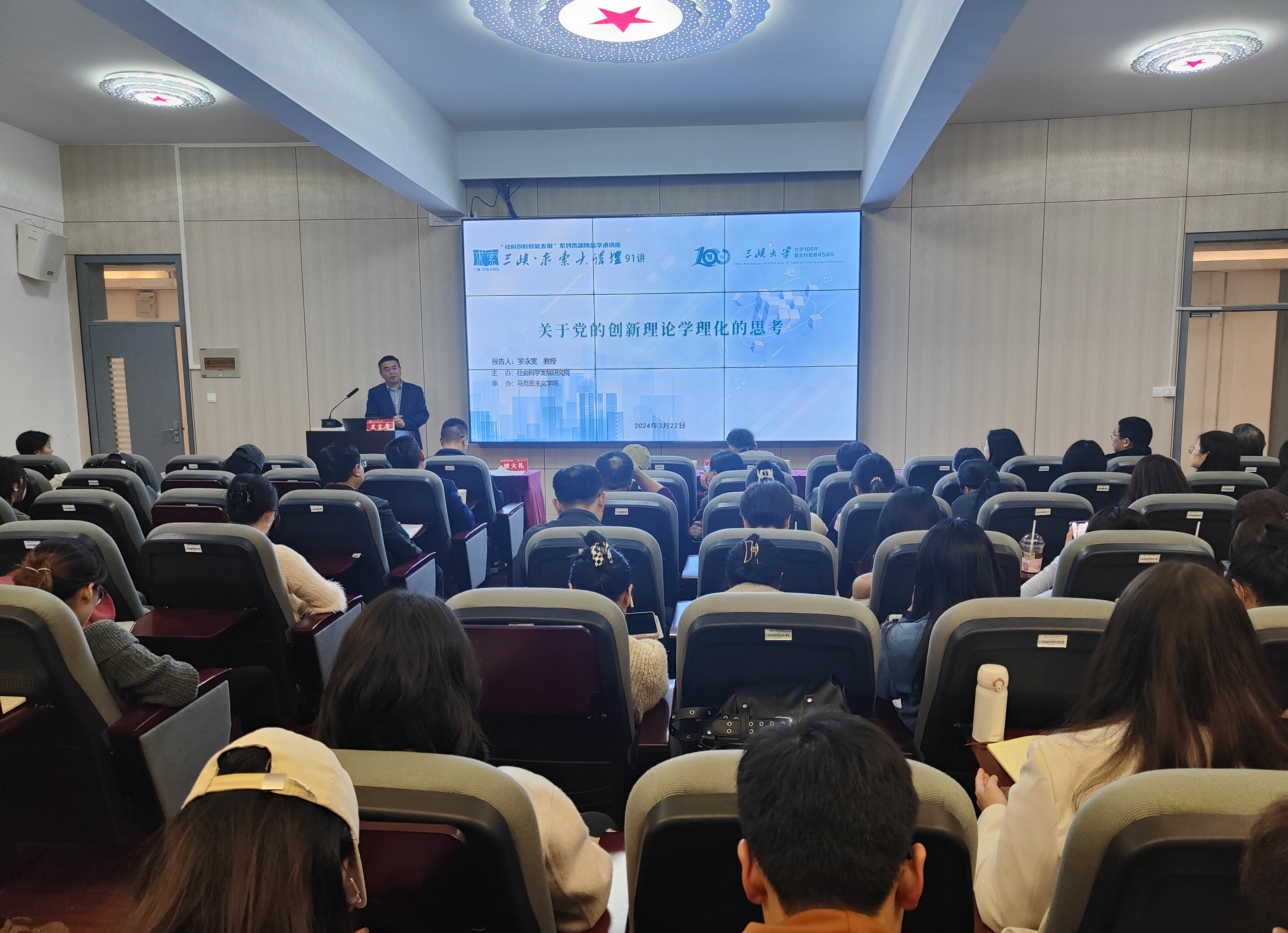本网讯(通讯员 王宜玲 刘军蓉) 3月22日,由社会科学发展研究院主办、马克思主义学院承办的“三峡·求索大讲坛”第91讲在W-2205报告厅举行。武汉大学马克思主义学院院长、博士生导师罗永宽教授应邀作了题为“关于党的创新理论学理化的思考”的学术报告。报告会由学校马克思主义学院副院长潘大礼教授主持。马克思主义学院百余名师生聆听了报告。