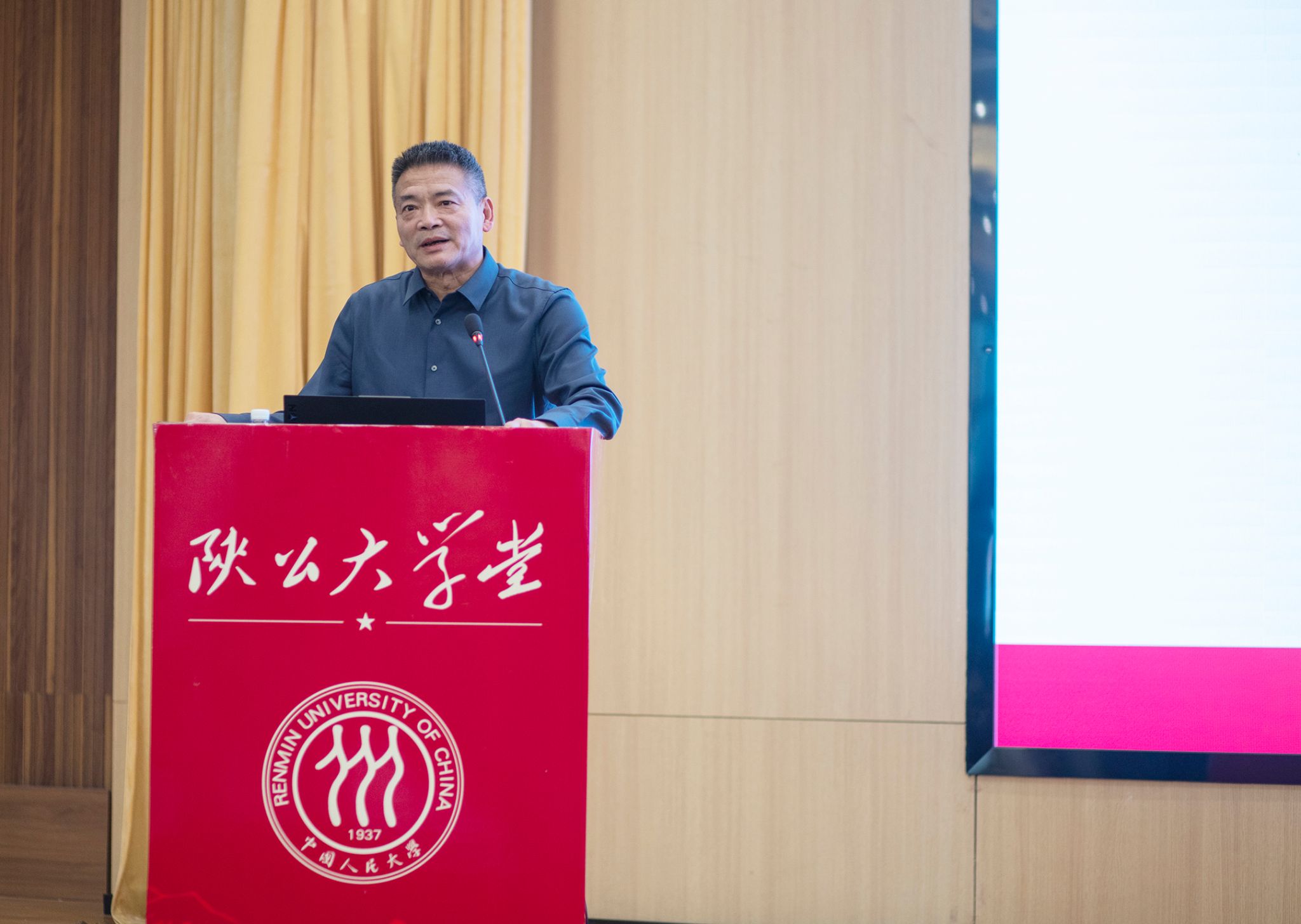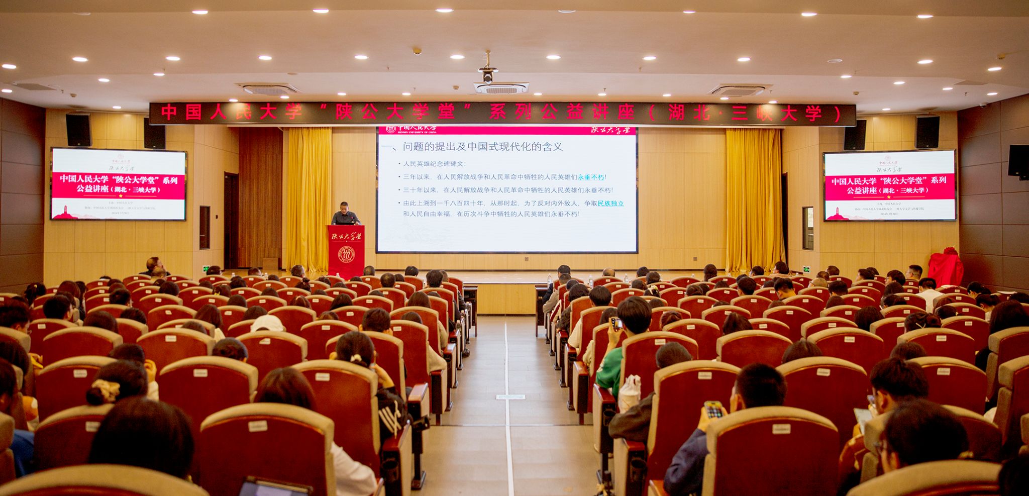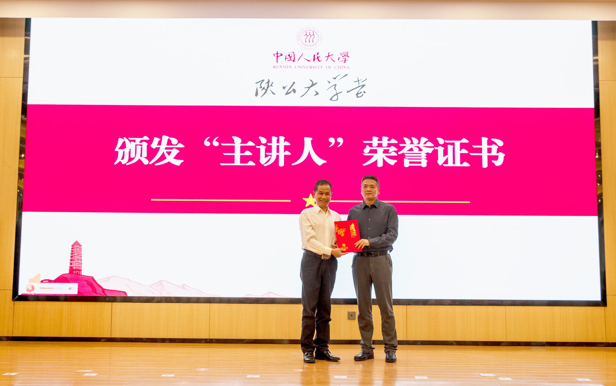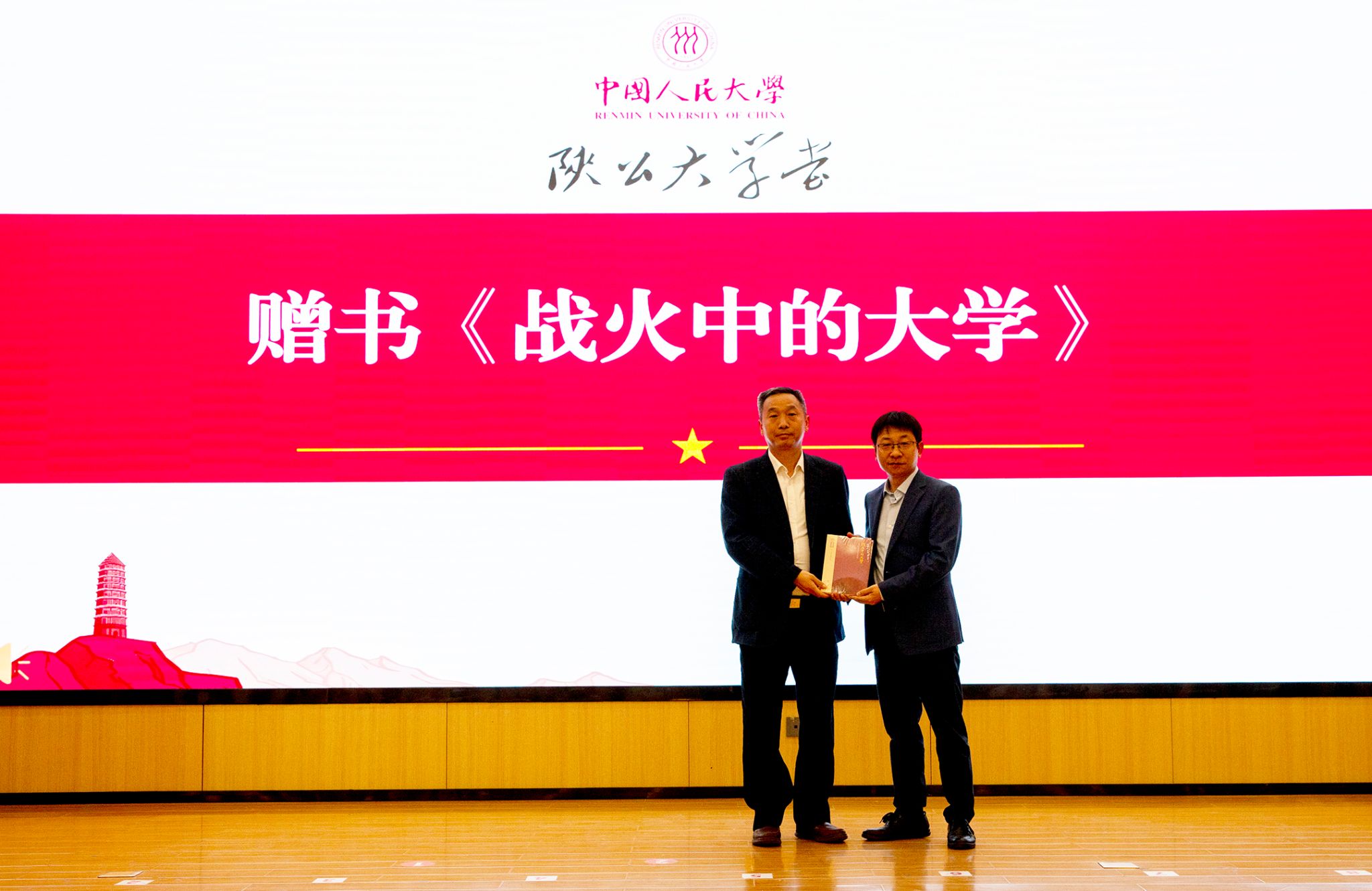 在讲座开始前,中国人民大学“陕公大学堂”在我校正式揭牌,中国人民大学湖北校友会副会长兼秘书长王全代表中国人民大学向我校文学与传媒学院院长刘波赠送了陕北公学首任校长、中国人民大学老校长成仿吾所著书籍《战火中的大学》,中国人民大学湖北校友会会长陈正武为雷达教授颁发了“陕公大学堂”主讲人荣誉证书。