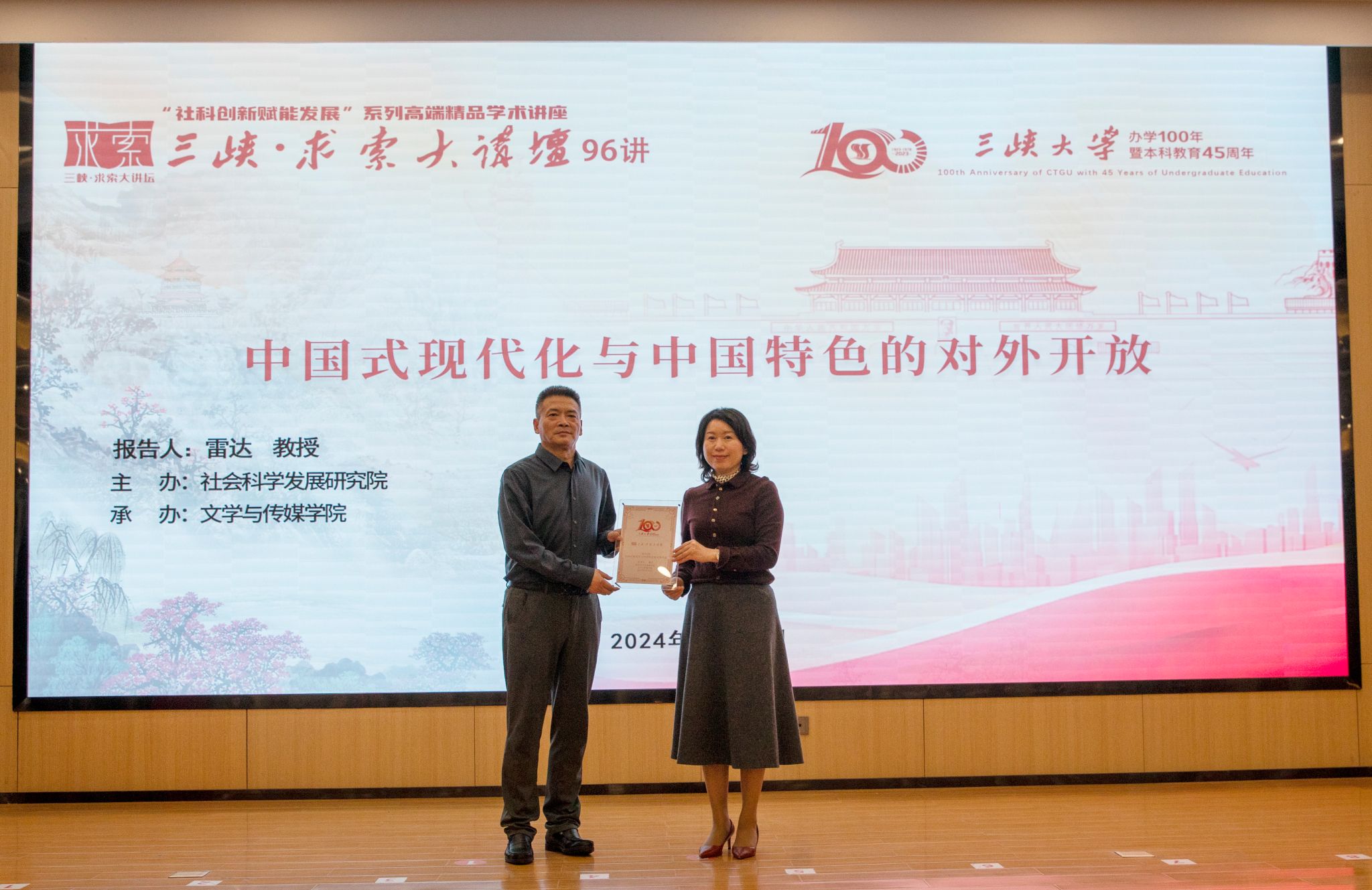 随后,我校文学与传媒学院副院长杜雪琴为雷达教授颁发了“求索大讲坛”主讲人纪念牌。