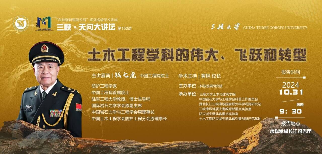 本网讯(通讯员 蔡悦曼)10月31日上午,中国工程院首届院士、陆军工程大学教授、博士生导师钱七虎做客“三峡•天问大讲坛”第一百六十讲,通过线上方式在长江报告厅为云鼎4118网站师生做了题为《土木工程学科的伟大、飞跃和转型》的学术报告。报告会由校长黄艳教授主持,校学术委员会主任李建林教授及土木与建筑学院师生500余人聆听了报告。本次报告会由科技发展研究院主办、土木与建筑学院承办。