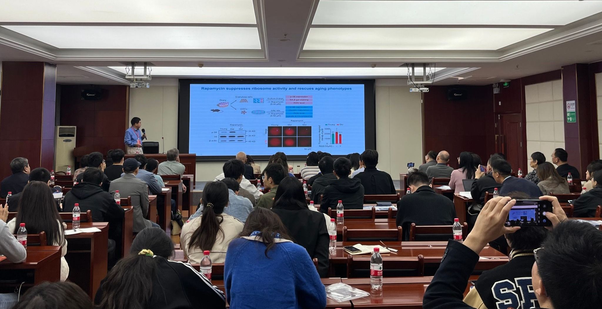 本次学术报告题为“雷帕霉素(西罗莫司)治疗不孕症”。雷帕霉素,是一种可以防止器官移植失败的药物,能够安全且有效延长女性的生育年龄。刘林教授指出,衰老的卵母细胞和周围的卵丘细胞表现出核糖体基因的上调和翻译的增加。随着年龄的增长,异染色质减少,雷帕霉素可减少蛋白质翻译,改善卵母细胞和胚胎的质量和发育,缓解卵丘细胞衰老,从而延长女性生育能力、增强临床妊娠率。