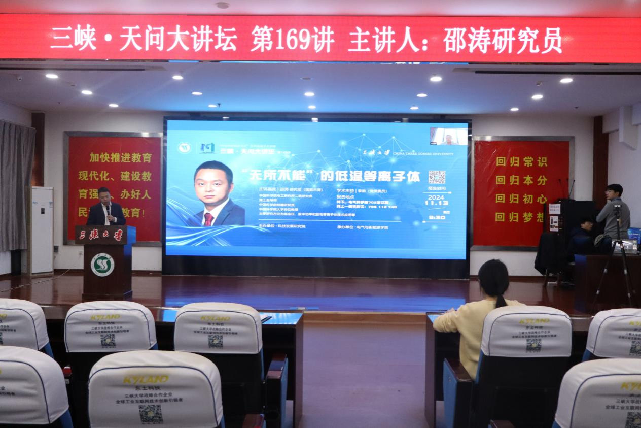 本网讯(通讯员 佘小莉) 11月13日上午,“三峡•天问大讲坛”第169讲在电气科学楼702报告厅举行。国家级人才、中国科学院电工研究所邵涛研究员应邀作了学术报告。报告会由科技发展研究院主办、电气与新能源学院承办。来自电气与新能源学院的200余名师生聆听了报告会。