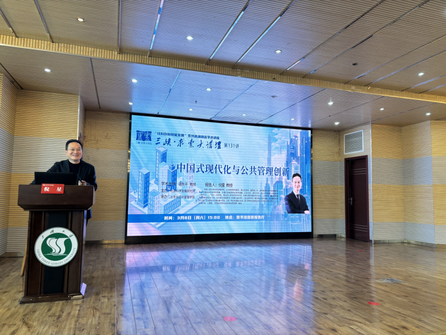 本网讯(文/万兰芳 赵颖 图/周妮)3月8日下午,由社会科学发展研究院主办、法学与公共管理学院承办的“三峡·求索大讲坛”第131讲在图书馆屈原学术报告厅顺利举行。本次报告会特邀中国人民大学纪检监察学院、公共管理学院倪星教授主讲,围绕“中国式现代化与公共管理创新”主题与现场师生进行了分享。报告会由法学与公共管理学院院长骆东平教授主持。