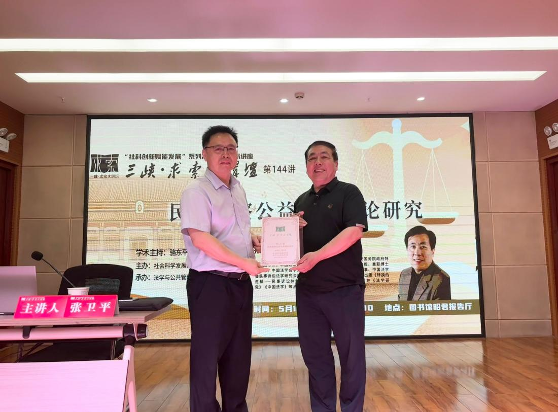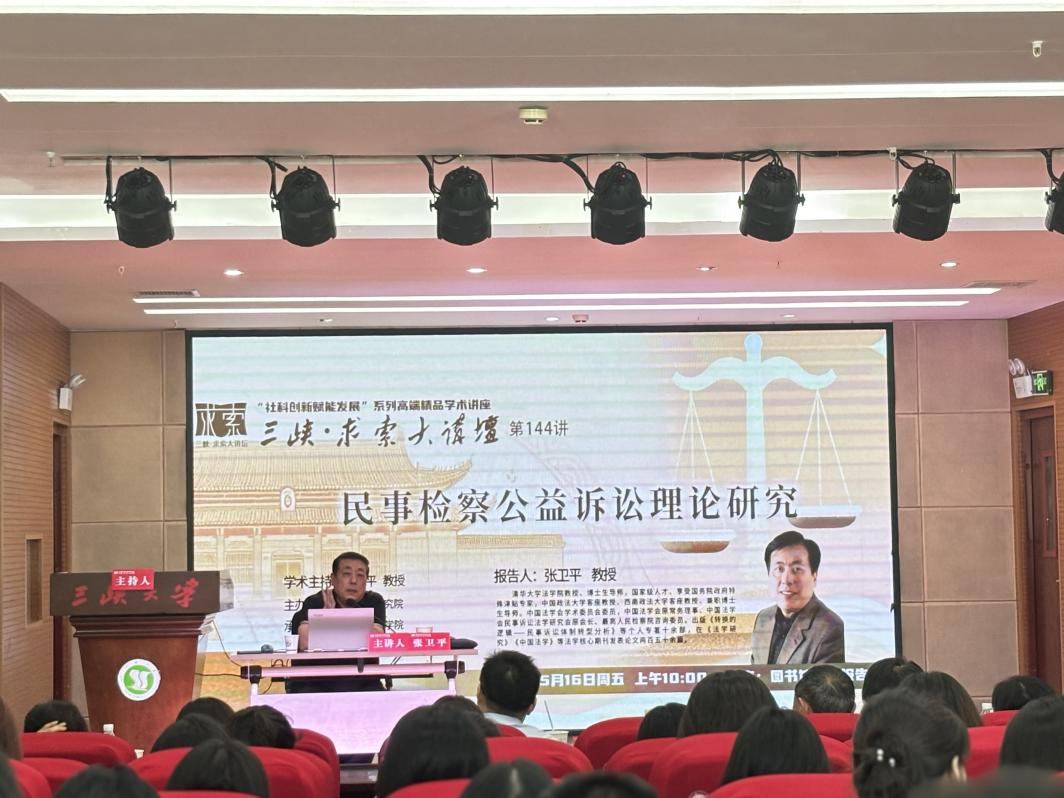 本网讯(通讯员 张思晴 周妮) 5月16日,“三峡·求索大讲坛”第144讲在图书馆昭君报告厅举行。清华大学法学院张卫平教授应邀为我校师生带来了一场题为《民事检察公益诉讼理论研究》的精彩学术报告。法学与公共管理学院法学系教师及研究生等百余名师生到场聆听了报告,报告会由法学与公共管理学院院长骆东平教授主持。