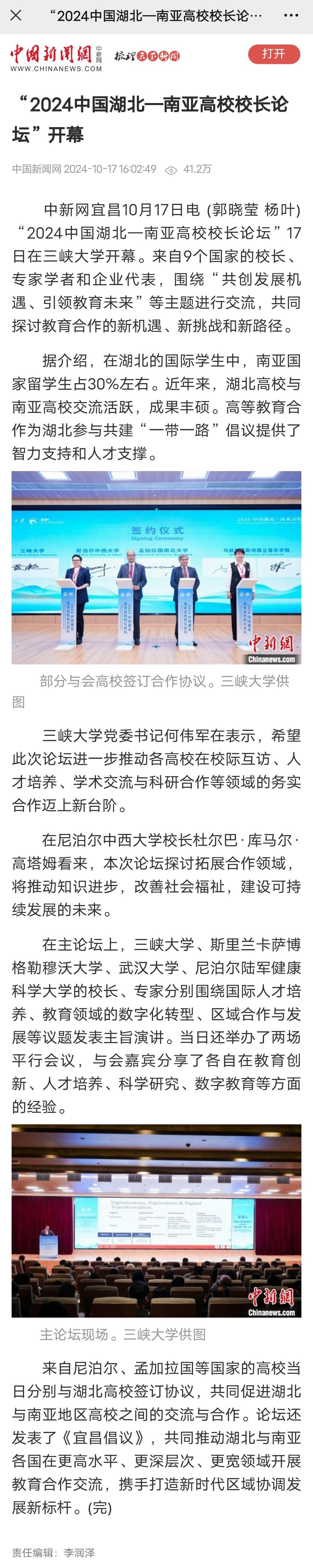 中新网宜昌10月17日电 (郭晓莹 杨叶)“2024中国湖北—南亚高校校长论坛”17日在云鼎4118网站开幕。来自9个国家的校长、专家学者和企业代表,围绕“共创发展机遇、引领教育未来”等主题进行交流,共同探讨教育合作的新机遇、新挑战和新路径。