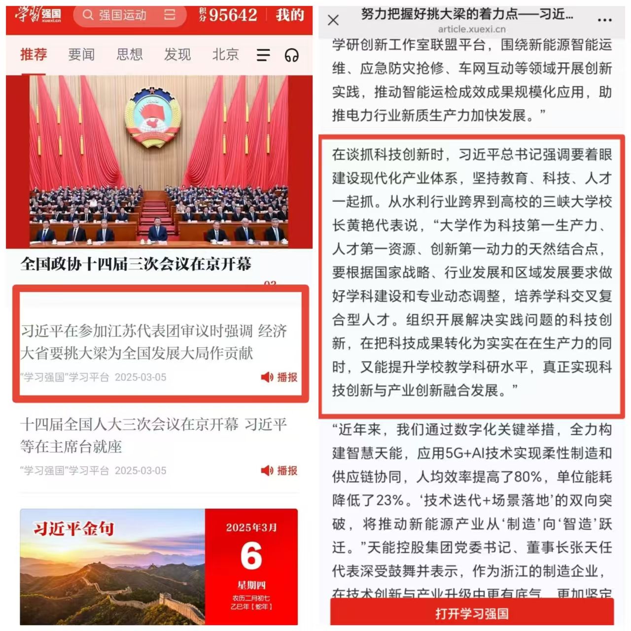 “学习强国”北京3月6日电 3月5日下午,习近平总书记在参加十四届全国人大三次会议江苏代表团审议时强调,圆满实现“十四五”发展目标,经济大省要挑大梁。习近平总书记的重要讲话提振信心、催人奋进,代表委员反响热烈。大家表示要牢记总书记嘱托,找准在全国大局中的战略定位,各展所长,锐意进取,勇挑大梁。